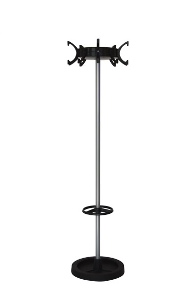 1.750 mm hoch, Hakenkranz 450 mm ø, drehbar, mit 5 Hut- und 10 Mantelablagen, Kunststoff schwarz, Gussfuß ca. 420 mm ø, Gewicht ca. 20 kg.