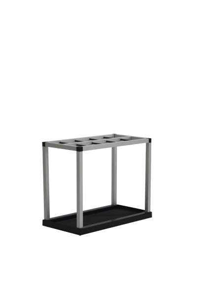 einseitig 160 mm breit, doppelseitig 260 mm breit, aus Leichtmetall-Vierkantrohr, 20 x 20 mm, mattsilber mit Nylonverbindern und lackiertem Becken, schwarz. Schirmhalter mit Unterteilungen im Abstand von 100 mm, Schirmbecken mit Gummieinlage.