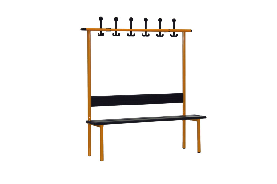 Konsolen aus Rundrohr 40 mm ø, kunststoffbeschichtet, Füße mit Bodenschonern oder Bodenbefestigungsbolzen zur unsichtbaren Bodenbefestigung. Hakenabstand 200 mm. Bankauflagen mit Stahleinlage und Rückenlehne aus hochwertigem Kunststoffkammerprofil, 125 x 30 mm, allseitig abgerundet.