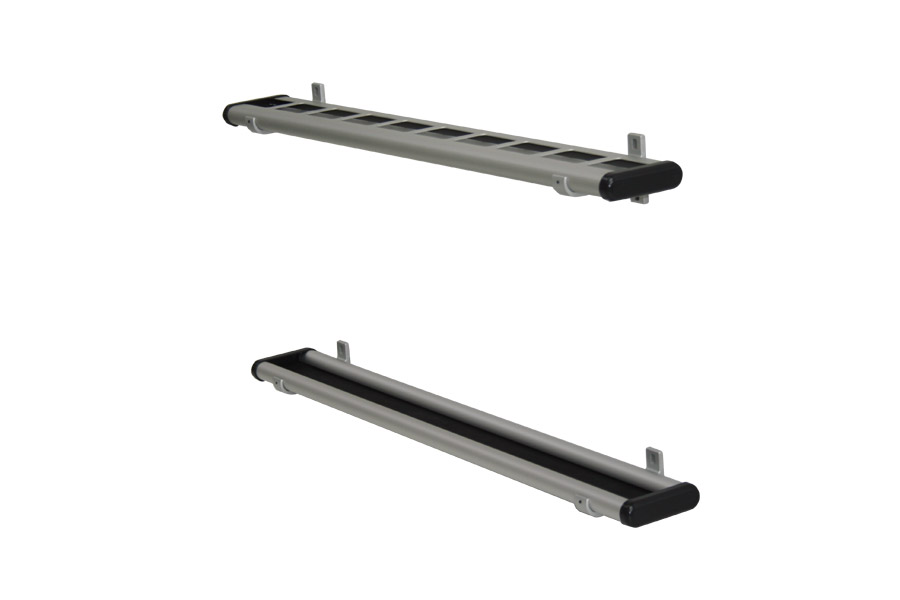 133mm tief, Schirmhalter mit Ausstanzungen im Abstand von 100mm und Schirmbecken mit Gummieinlage, mit schwarzen Endkappen, stabile Wandkonsolen, ca. alle 1.000 mm, aus Leichtmetall mattsilber